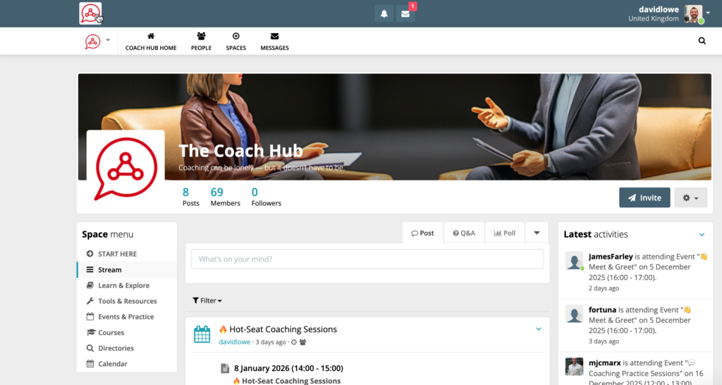 The Coach Hub is a supportive community where coaches practise together, explore challenges, share ideas and grow their craft. Through hot-seat sessions, meet-and-greets, business development conversations and shared resources, members connect, learn and build confidence in a relaxed, encouraging environment.